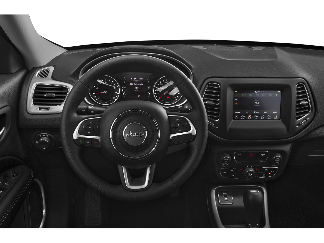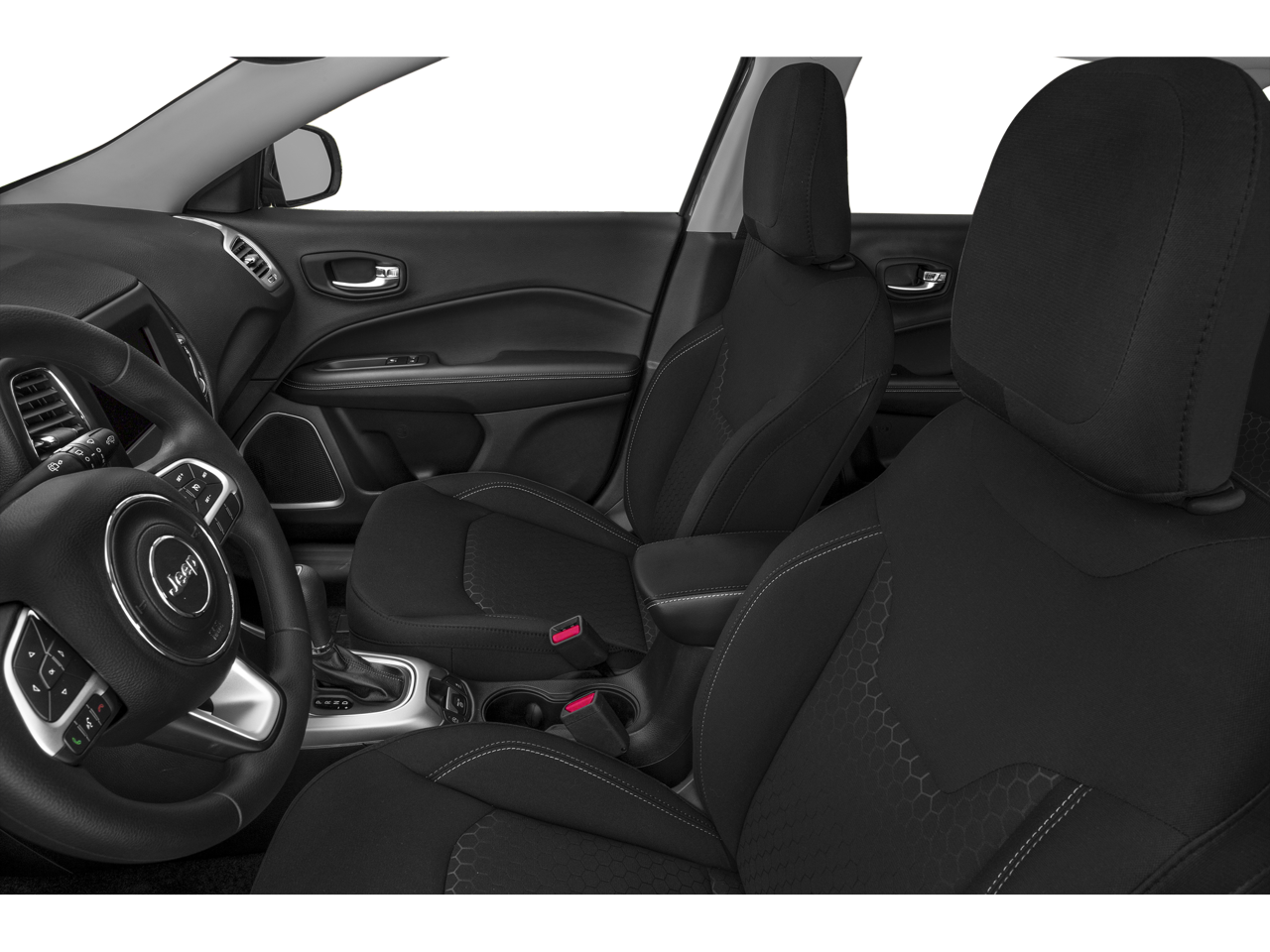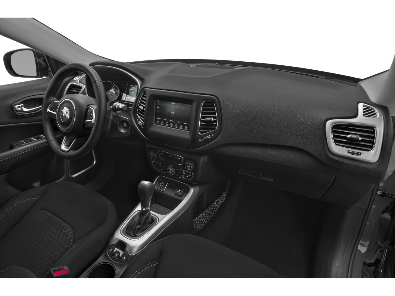 3.502 Axle Ratio, 4-Wheel Disc Brakes, 6 Speakers, ABS brakes, Air Conditioning, Alloy wheels, Altitude Special Edition, AM/FM radio: SiriusXM, Anti-whiplash front head restraints, Apple CarPlay/Android Auto, Automatic temperature control, Black Day Light Opening Moldings, Black Grille w/Black Rings, Black Roof, Brake assist, Bright Exhaust Tip, Bumpers: body-color, Compass, Delay-off headlights, Driver door bin, Driver vanity mirror, Dual front impact airbags, Dual front side impact airbags, Electronic Stability Control, Four wheel independent suspension, Front anti-roll bar, Front Bucket Seats, Front Center Armrest w/Storage, Front dual zone A/C, Front fog lights, Front License Plate Bracket, Front reading lights, Fully automatic headlights, Gloss Black Compass Badge, Gloss Black Fog Lamp Bezels, Gloss Black Jeep Badge, Gloss Black Lower Rear Fascia Valance, Heated door mirrors, Illuminated entry, Knee airbag, Leather Shift Knob, Low tire pressure warning, Manufacturer's Statement of Origin, Occupant sensing airbag, Outside temperature display, Overhead airbag, Overhead console, Panic alarm, ParkView Rear Back-Up Camera, Passenger door bin, Passenger vanity mirror, Piano Black Interior Accents, Power door mirrors, Power steering, Power windows, Premium Cloth/Vinyl Bucket Seats, Quick Order Package 28B Altitude, Radio: Uconnect 4 w/7 Display, Rear anti-roll bar, Rear seat center armrest, Rear window defroster, Rear window wiper, Remote keyless entry, Roof rack: rails only, Speed control, Split folding rear seat, Spoiler, Steering wheel mounted audio controls, Tachometer, Telescoping steering wheel, Tilt steering wheel, Traction control, Trip computer, Variably intermittent wipers, Wheels: 17 x 7.0 Silver Painted Aluminum, Wheels: 18 x 7.0 Black Aluminum.